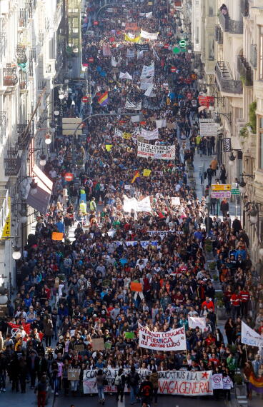 Una multitudinaria manifestación de estudiantes mayoritariamente de Secundaria y Bachillerato, además de universitarios, en protesta por los recortes en Educación ha colapsado hoy las calles del centro de la ciudad de Valencia. El Sindicato de Estudiantes, convocante de la marcha, ha llamado a los sindicatos mayoritarios a declarar una huelga general tanto en educación como en los centros de trabajo, y ha logrado congregar a, según ha dicho, unos 10.000 manifestantes, cifra que fuentes policiales han situado en "miles".
